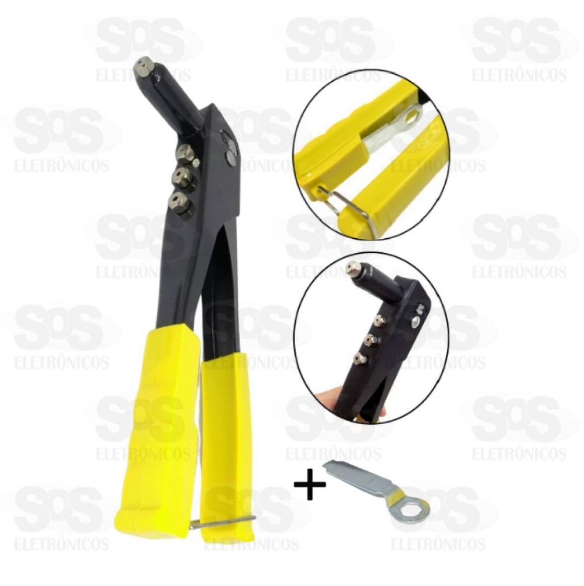Descrição: Alicate rebitador específico para aplicação de rebite pop em aluminio, lonas, couro, ferro e madeira. Alça de borracha. 4 tamanhos de rebite - 2.4mm / 3.2mm / 4.0mm / 4.8mm