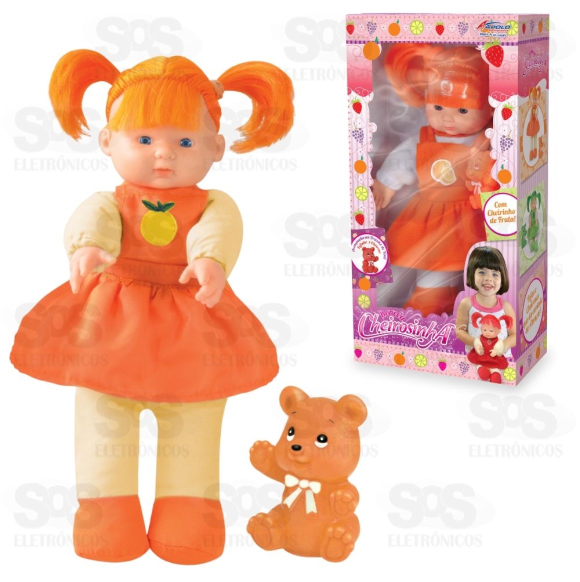 A Boneca Cheirosinha é perfeita para a criança que adora brincar de boneca. Ela é linda, delicada, com traços que parecem um bebê de verdade e vem com um cheirinho de Fruta que vai encantar as pequenas mamães. A boneca acompanha um lindo ursinho e roupinha com estampa de fruta. A diversão é garantida!