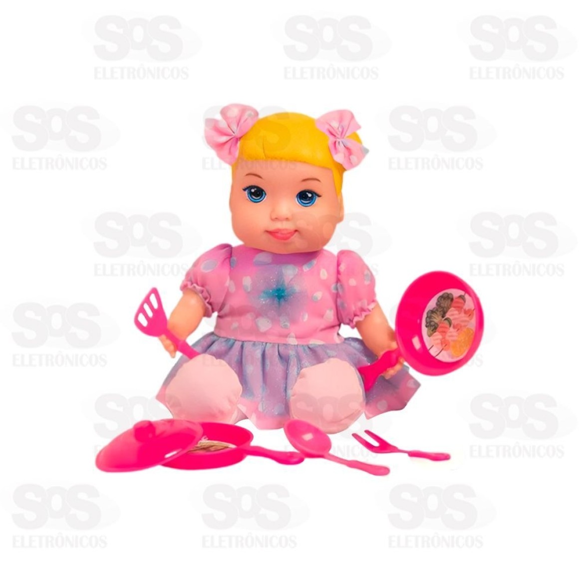 Acompanha acessórios para brincar de comidinha com a boneca.