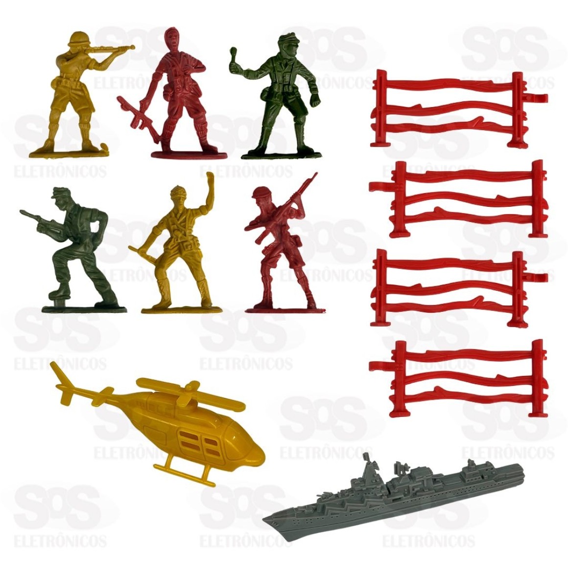 Acompanha 33 peças, entre soldados, helicóptero, navio, cercas e árvore.