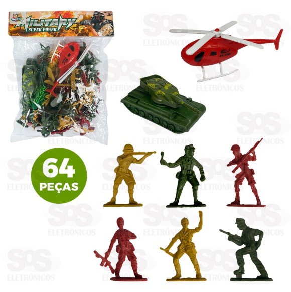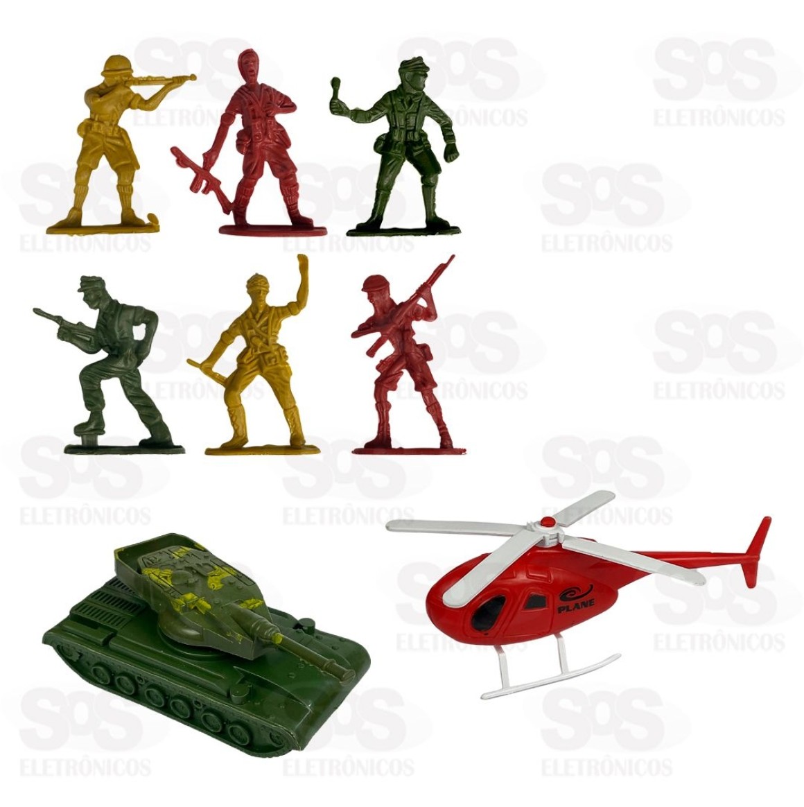 Acompanha 64 peças, entre soldados, helicóptero, tanque e árvores.