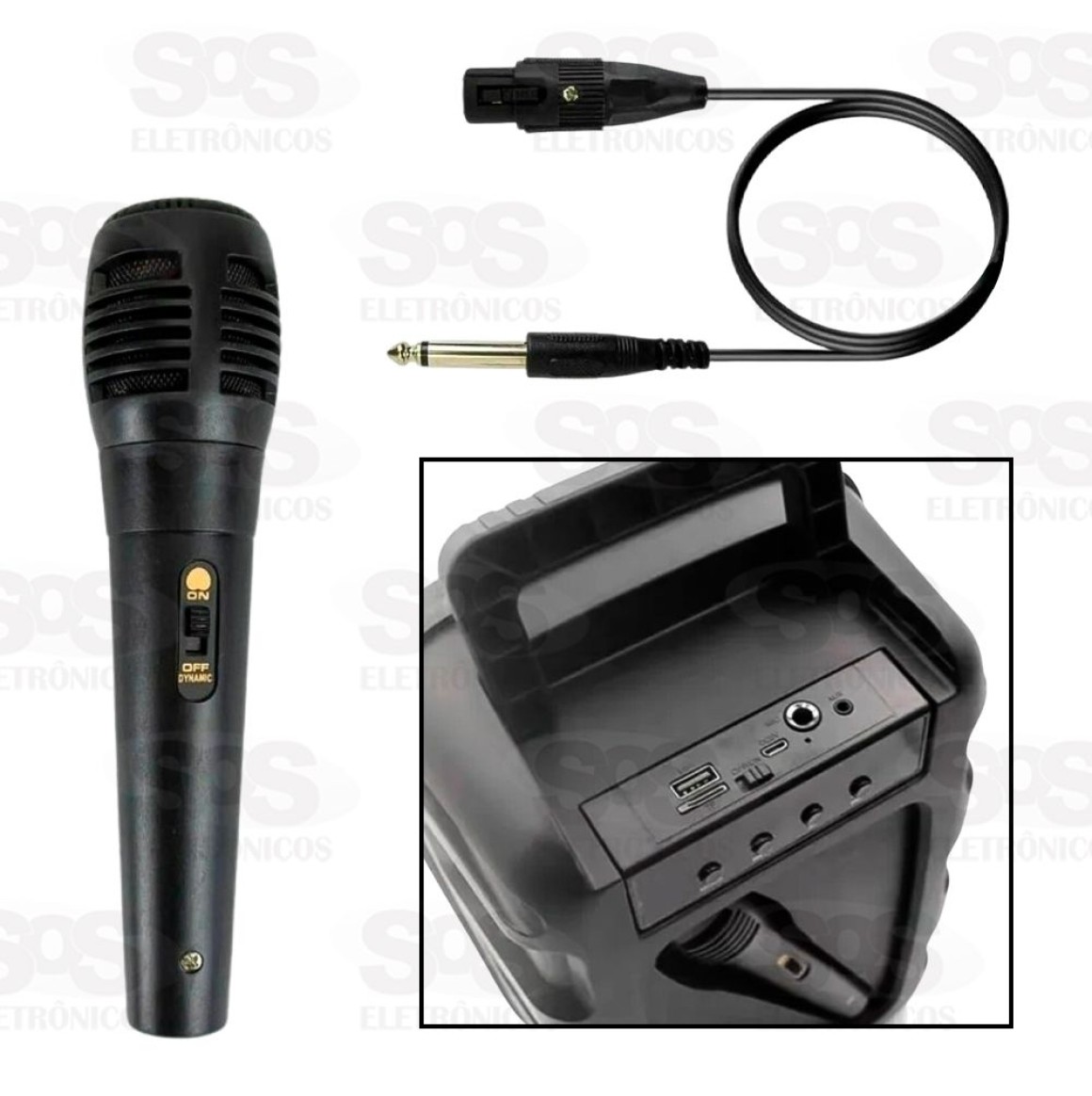 Entradas USB, Cartão TF, Cabo AUX, Microfone e Micro USB V8