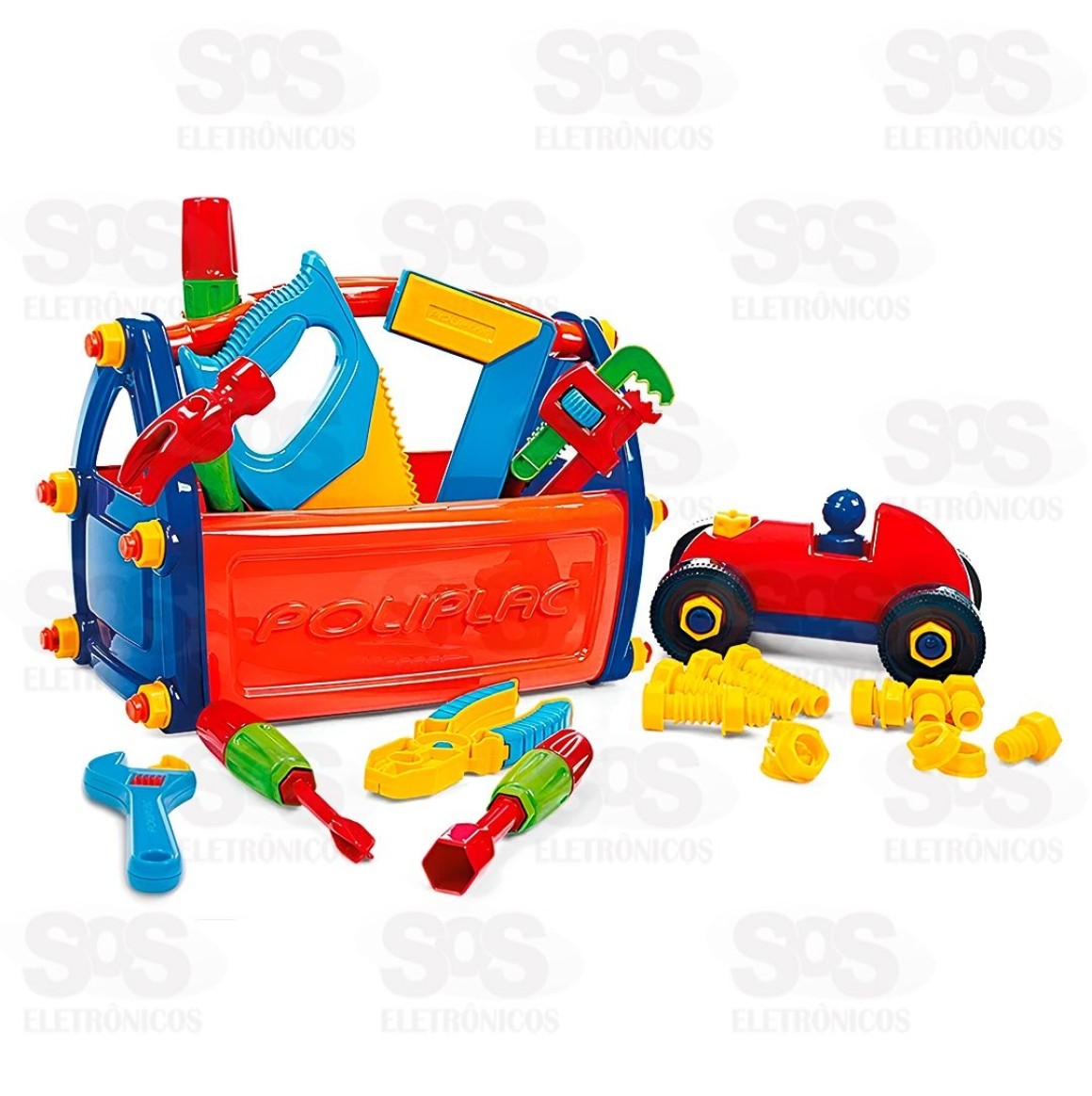Itens: 1 Martelo, 1 Alicate, 1 Serrote, 1 Esquadro, 1 Chave Grifo, 1 Chave Inglesa, 1 Chave Philips, 1 Chave de Fenda, 1 Chave Canhão, 10 Parafusos plásticos c/ porcas, 1 Carrinho e 1 Caixa de Ferramentas.