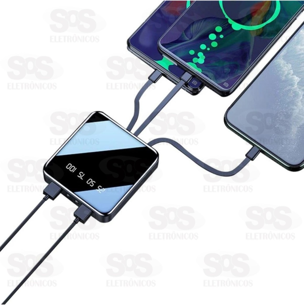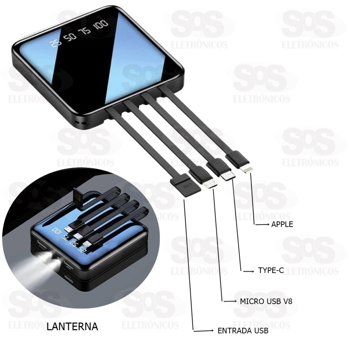 Este carregador possui 4 cabos para carregamento sendo compatíveis com IOS, Tipo C, Micro V8 e cabo adaptador USB, podendo ser conectado a uma fonte de carregamento, para carregar o power bank.