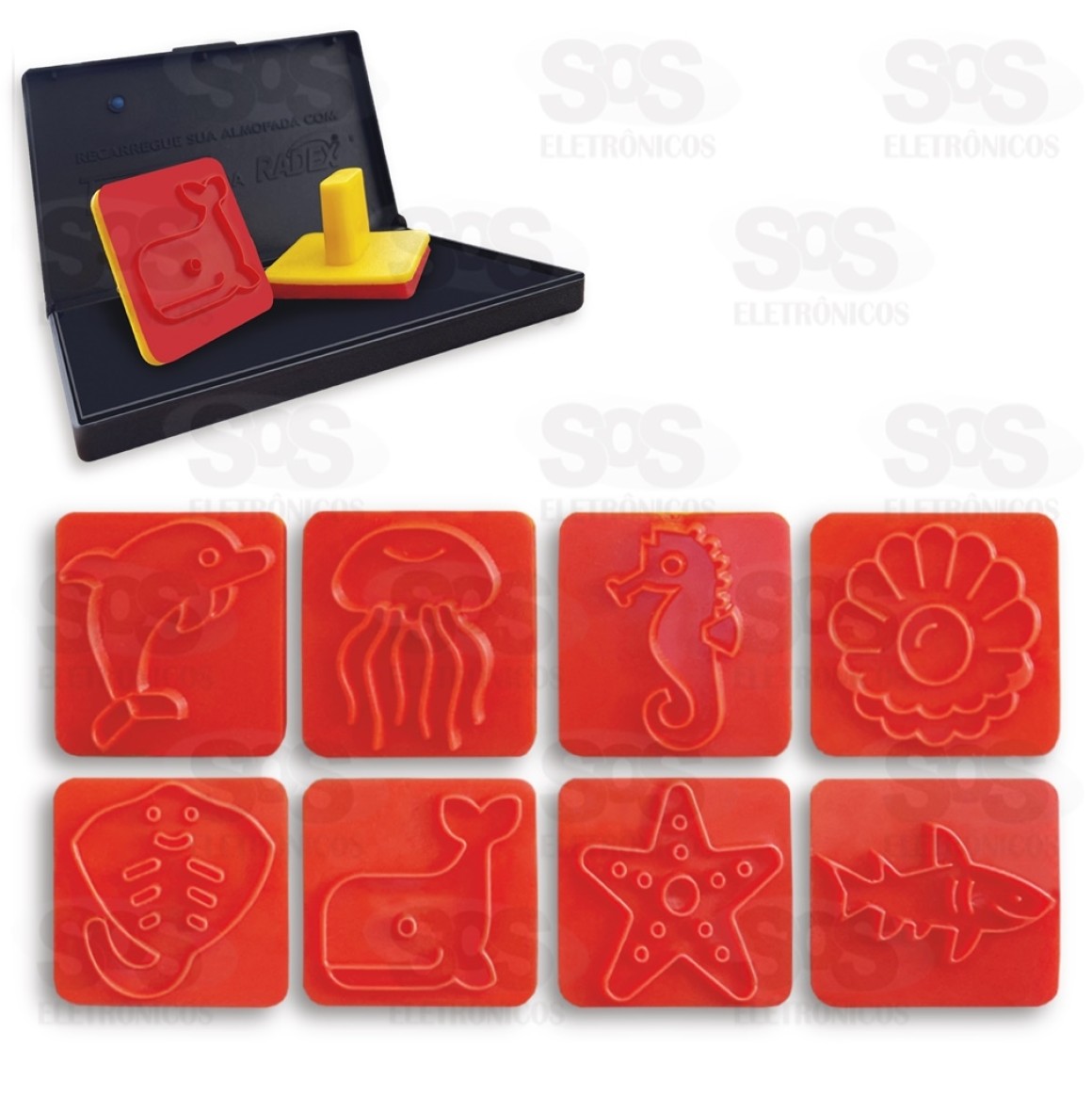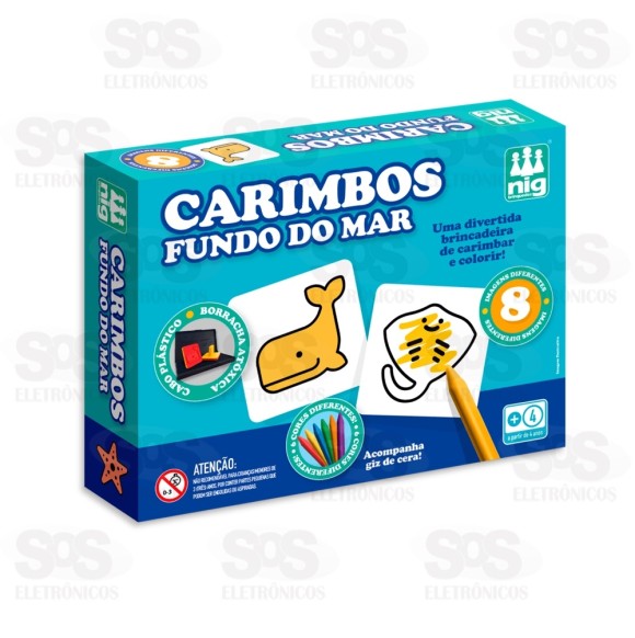 Caixa com 8 carimbos de figuras de Fundo do Mar e mais 6 giz de cera para crianças em fase pré-escolar. Indicado para ilustrar trabalhos e para auxiliar na alfabetização.