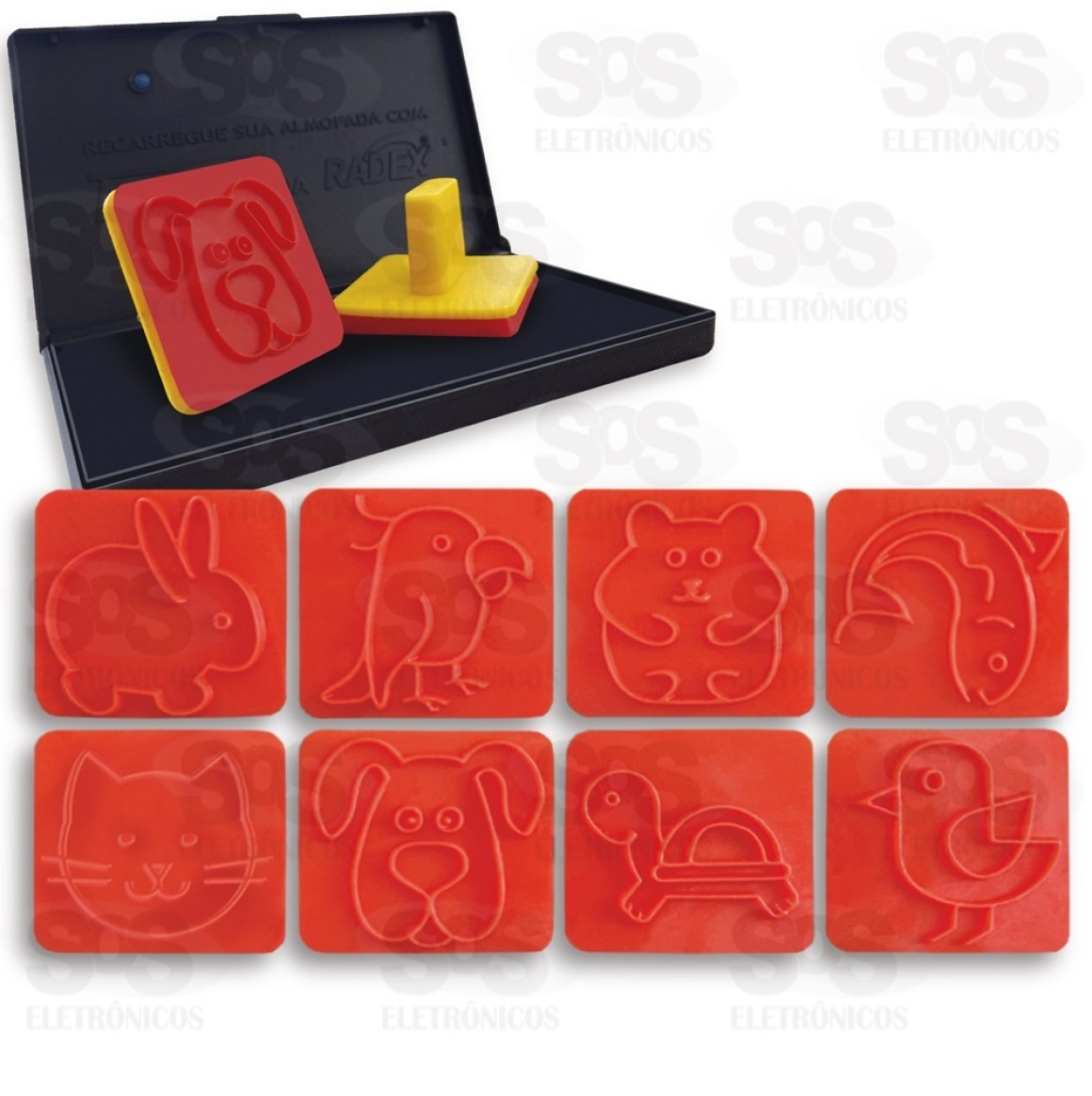 - Contém 8 carimbos + 6 giz de cera + 1 almofada com tinta