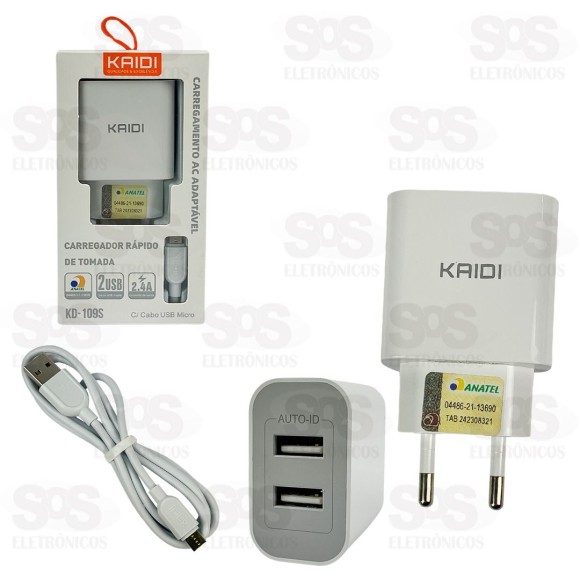 Carregador 2 USB 2.4A Com Cabo Micro USB V8 Kaidi KD-109S