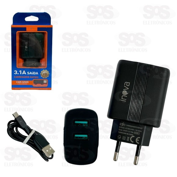 Carregador 2 USB 3.1A Com Cabo Micro USB V8 Inova CAR-3292S