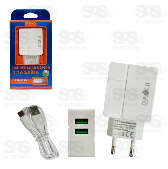 Carregador 2 USB 3.1A Com Cabo Type C Inova CAR-3235C
