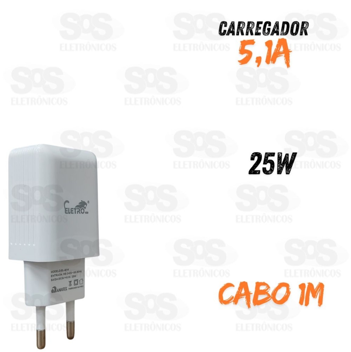 Carregador 25W USB 5.1A Cabo Micro USB V8 Eletromex EL-4014-V8