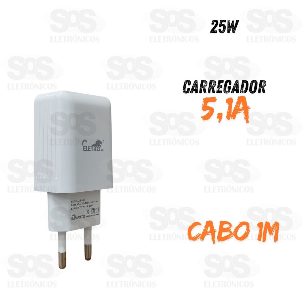Carregador 25W USB 5.1A Com Cabo Type -C Eletromex EL-4014-TY