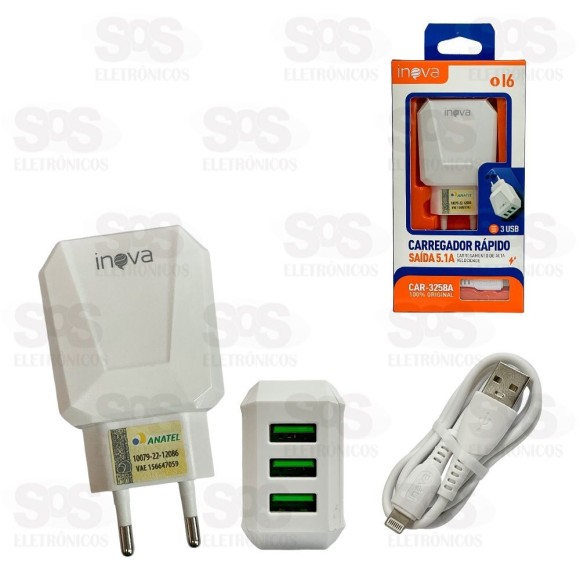 Carregador 3 USB 5.1A Com Cabo Iphone Inova CAR-3258A