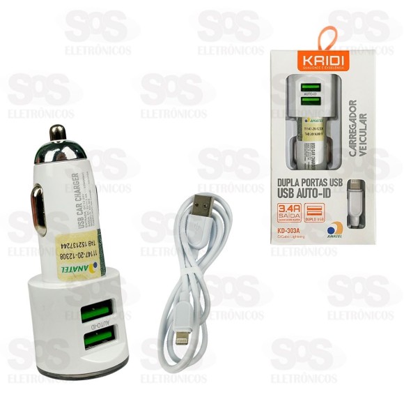 Carregador Automotivo 2 USB 3.4A Cabo Iphone Kaidi KD-303A