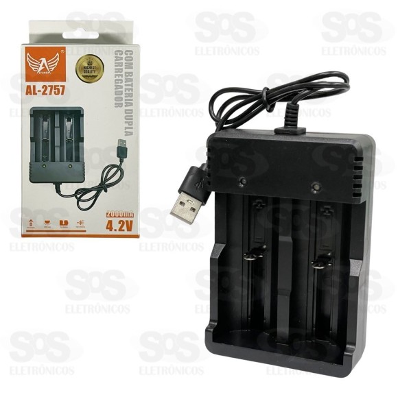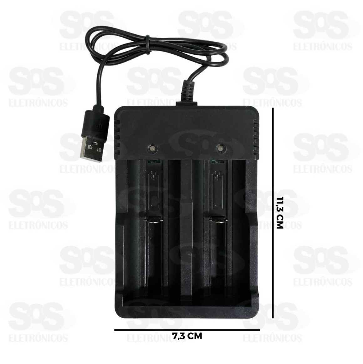 Carregador duplo compatível com baterias 18650, 26650, 14500, 16340 e 18500. Carga rápida e segura. Cabo de 52 cm. Material resistente. Tamanho: 11,3 x 7,3 cm