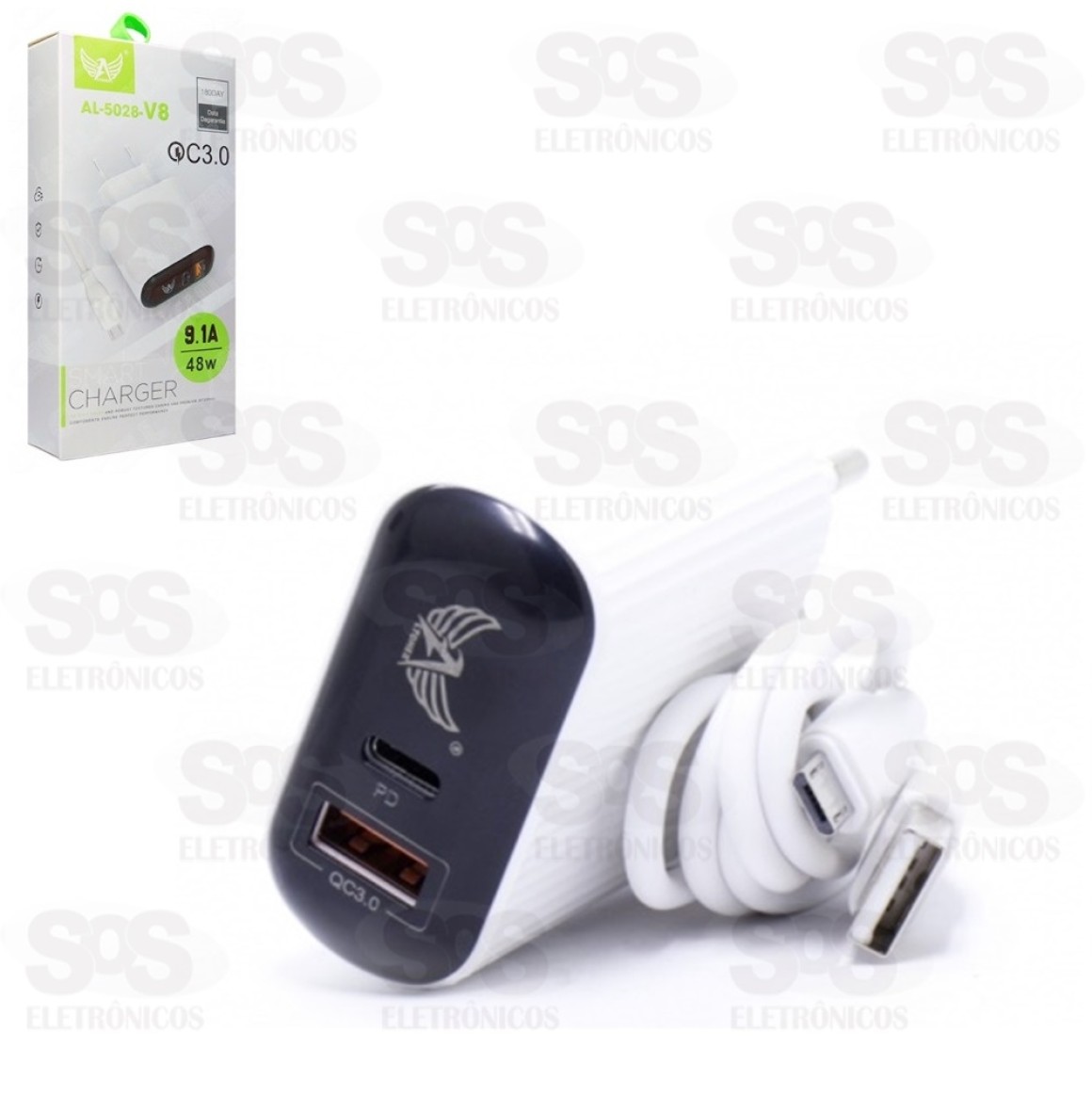Carregador Inteligente 48W Micro USB V8 com 1 USB + Type-c 9.1A Altomex AL-5028