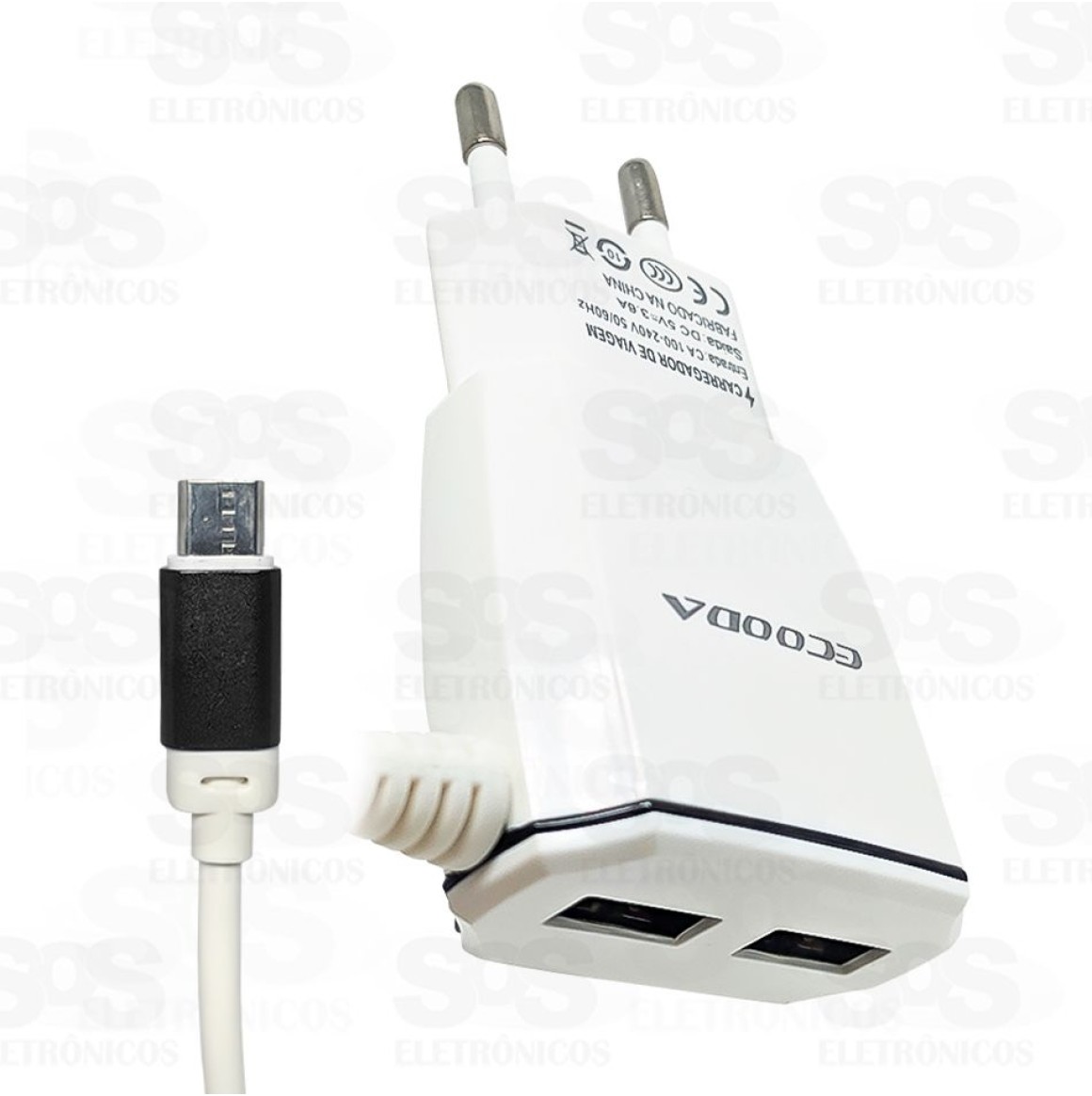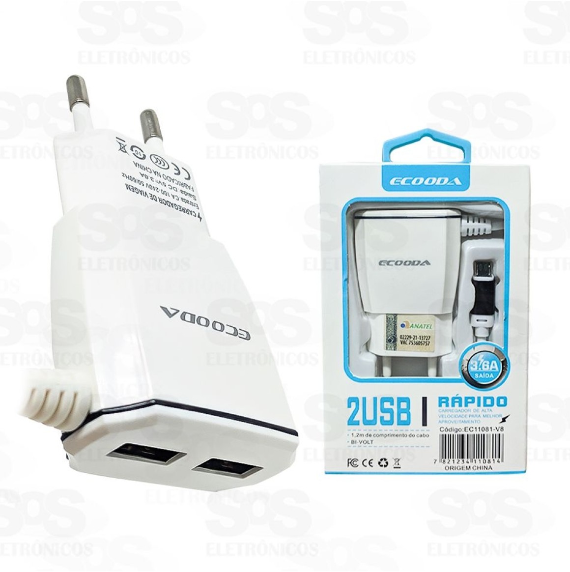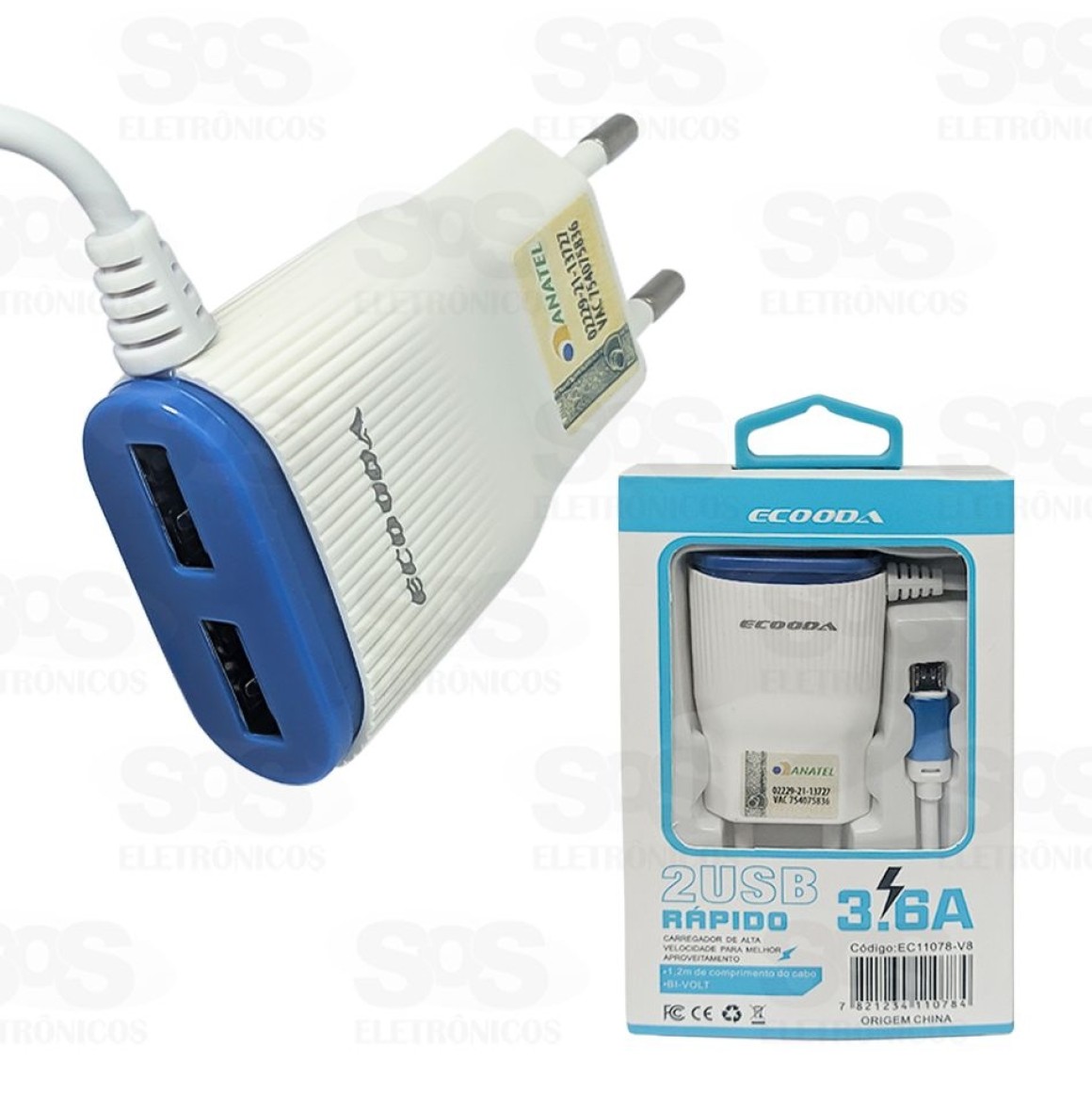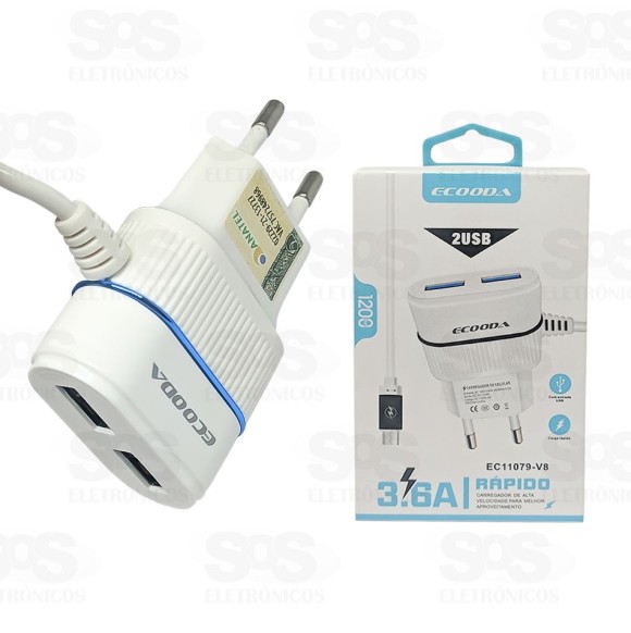 Carregador Micro USB V8 3.6A 2 USB Anatel Ecooda 11081 / 11079 / 11078