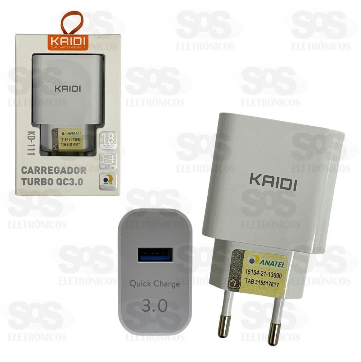 Carregador Turbo QC3.0 18W Kaidi KD-111 Carregador rápido e estável, carregue os aparelhos eletrônicos com segurança e velocidade. Conta com 1 entrada USB QC3.0 de 18W. Material de alta qualidade muito resistente. Cores variadas.