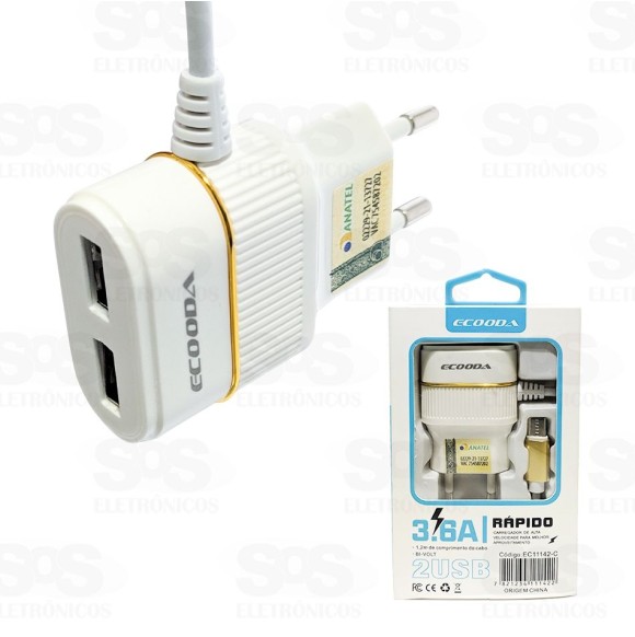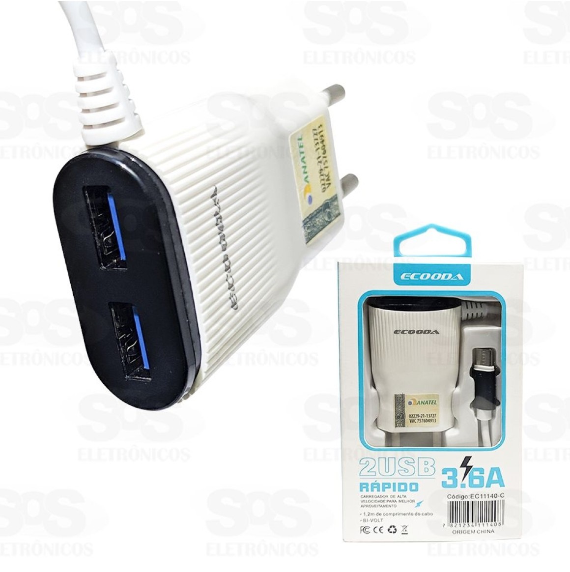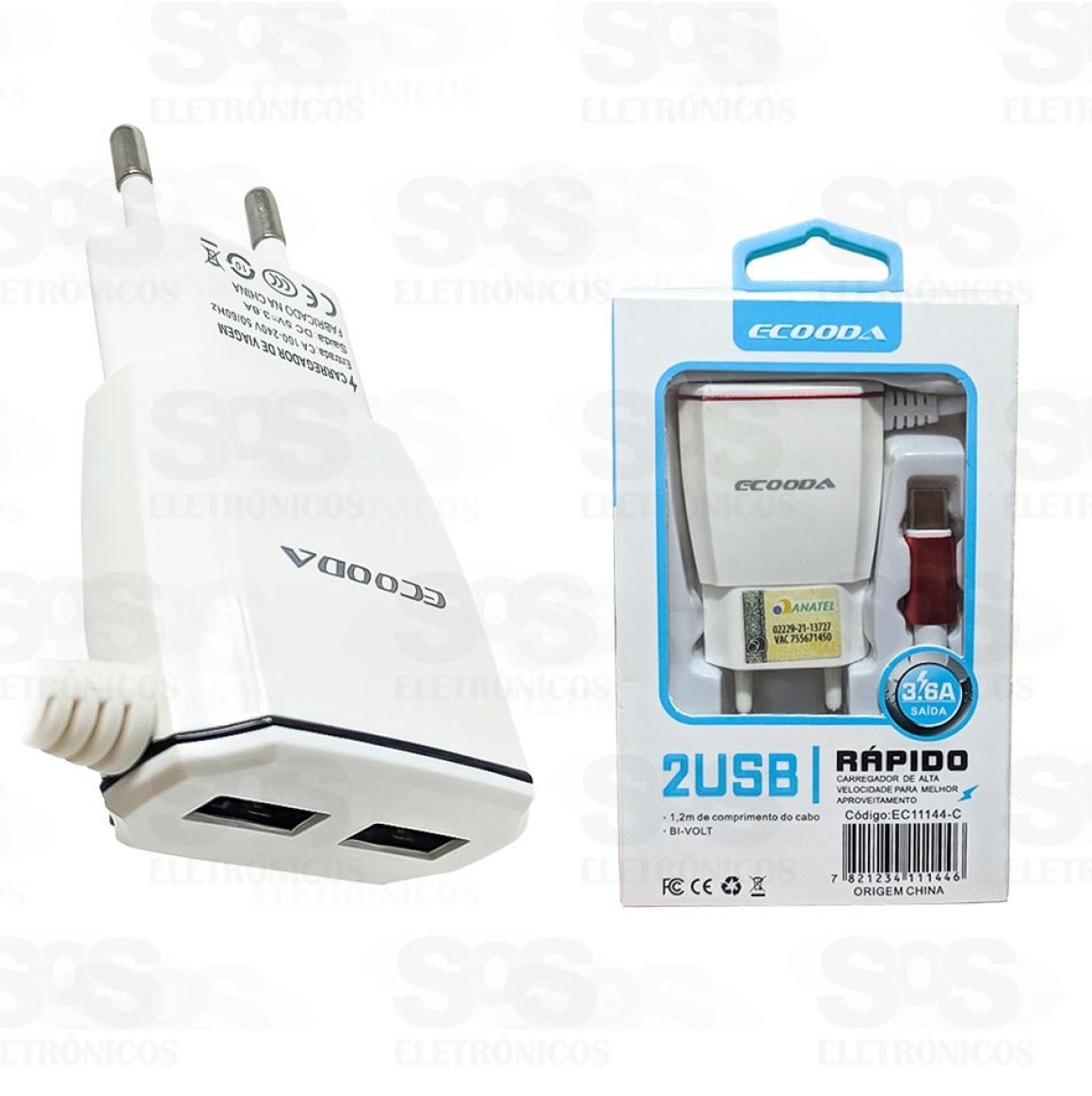 Carregador Type C 3.6A 2 USB Anatel Ecooda 11140 / 11142 / 11144