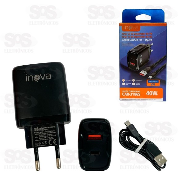 Carregador USB+PD 40W Com Cabo Micro USB V8 Inova CAR-3186S