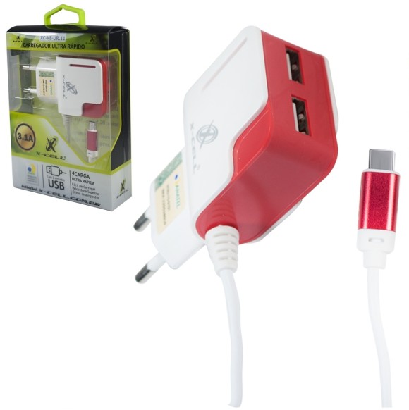 Carregador de parede ultra rápido com conector Type C e 2 entradas USB.