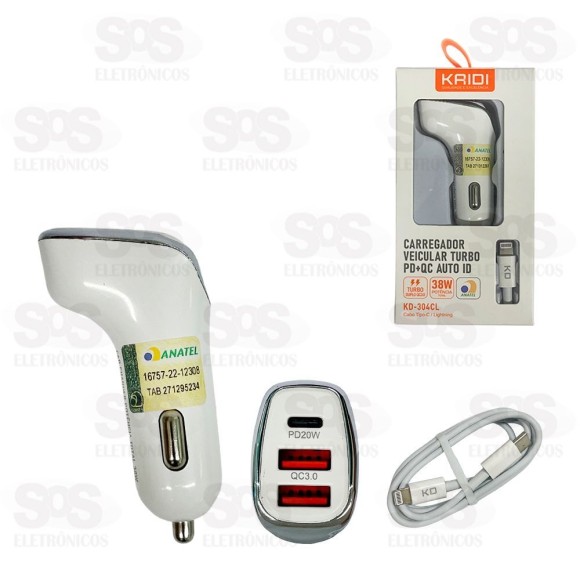 Carregador Veicular Com Cabo Iphone 38W Kaidi KD-304CL Com o carregador veicular você ficará sempre conectado, recarregue o celular, tablet, câmera e outros aparelhos enquanto dirige e em qualquer lugar. Funciona em todos os veículos com entrada 12V/24V (bivolt) no acendedor. Carregamento rápido e seguro. Acompanha cabo Type-C para Iphone de 1 metro. Tamanho: 7 x 4 cm Cores variadas