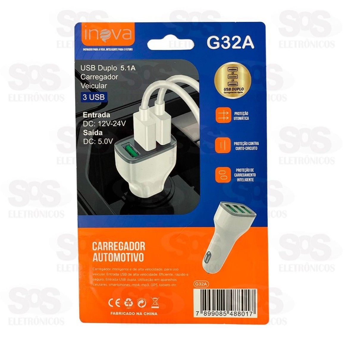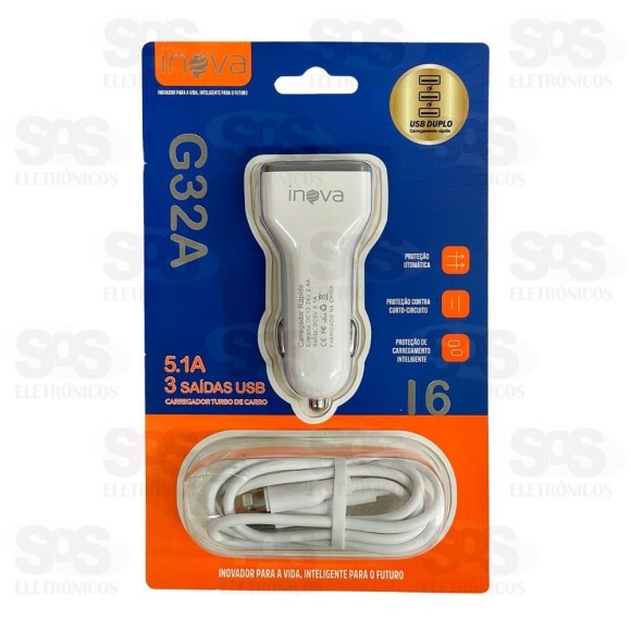 Carregador Veicular Com Cabo Iphone 5.1A 3 USB Inova G32A