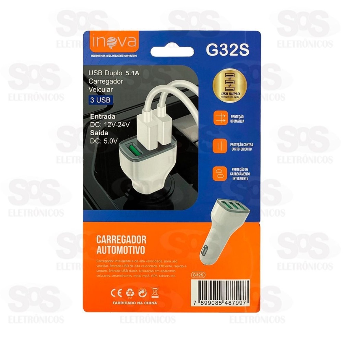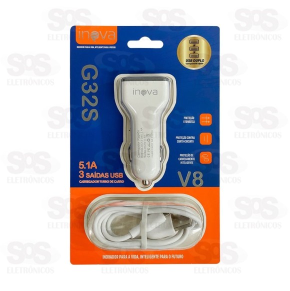 Carregador Veicular Com Cabo Micro USB V8 5.1A 3 USB Inova G32S