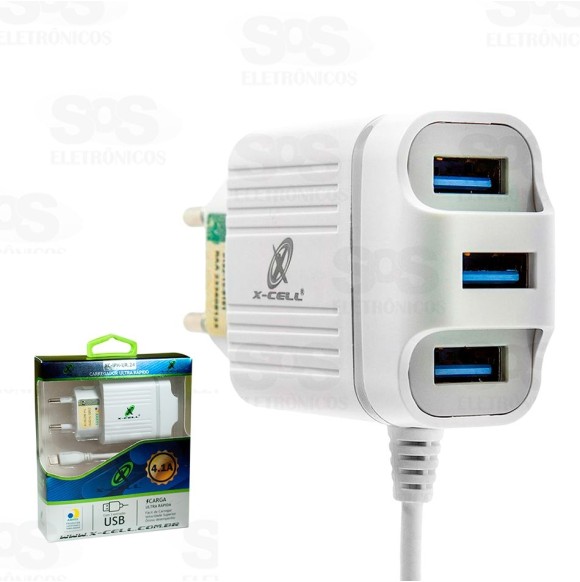 Carregador de parede ultra rápido com conector iPhone e 3 entradas USB.