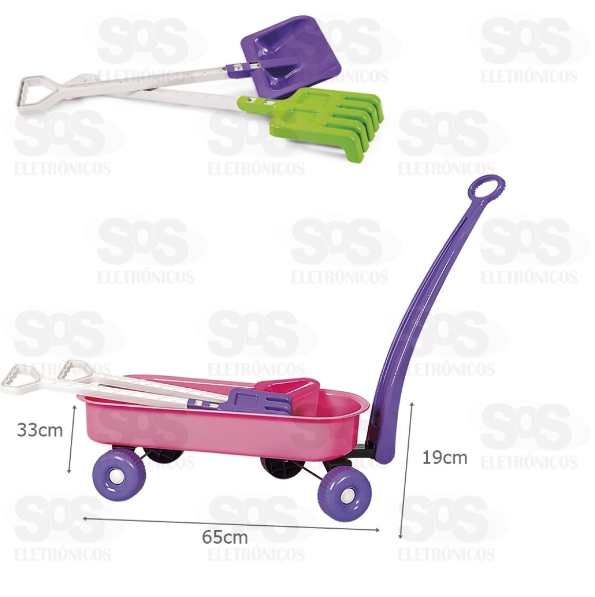 Feita em material super-resistente e rodas na medida certa para trilhar os caminhos mais sinuosos, vem com 1 Pá e 1 Rastel.