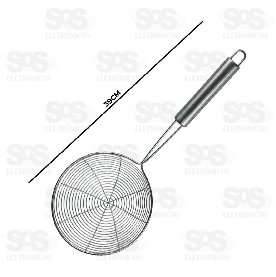 Escumadeira Para Frituras Aço Inox 39CM TOP2374 Peneira para frituras ótima para preparar pequenas porções com muita praticidade. Pode ser utilizado para batatas fritas, pastéis, frangos empanados, salgadinhos, churros, entre outros. Sua estrutura aramada permite que o óleo seja escorrido de maneira rápida e eficiente. Um utensílio que confere beleza e durabilidade em sua cozinha, muito leve e fácil de manusear, além de seu design moderno e inovador. Tamanho: 39 x 17 cm Material: Aço inox