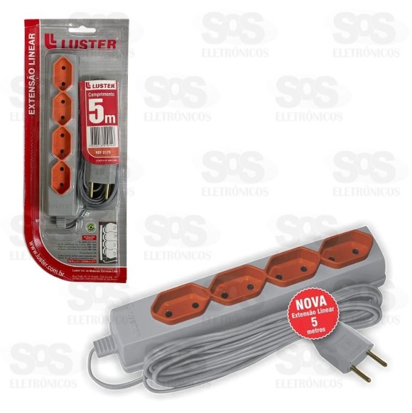 .Extensão 4 Tomadas 2 Pinos 5 Metros Luster 2175Extensão elétrica com 4 tomadas.Cabo de 5 metros.Tomadas de 2 pinos.Corrente máxima: 10A