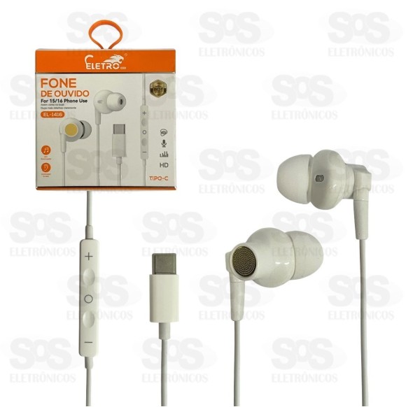 Fone De Ouvido Com Microfone Type C Eletromex EL-1416 Fone de ouvido estéreo com som de alta definição. Com microfone integrado e botões de controle no cabo. 110 cm de comprimento. Conexão Type-C.