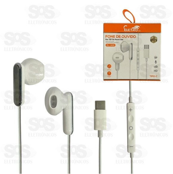 Fone De Ouvido Com Microfone Type C Eletromex EL-1418 Fone de ouvido estéreo com som de alta definição. Com microfone integrado e botões de controle no cabo. 110 cm de comprimento. Conexão Type-C.