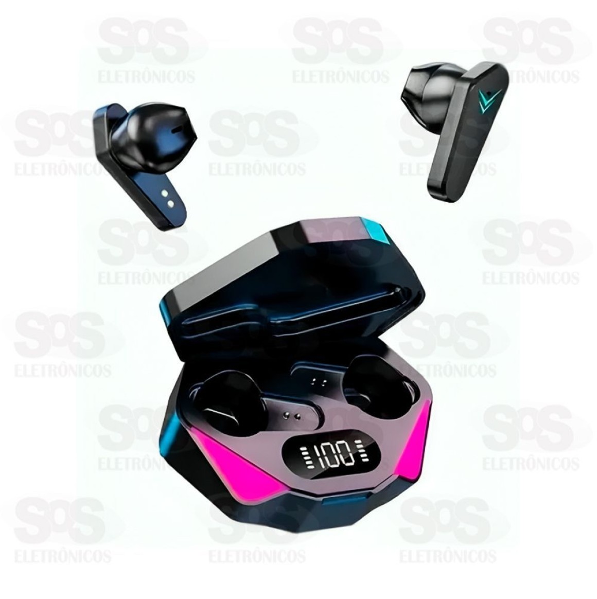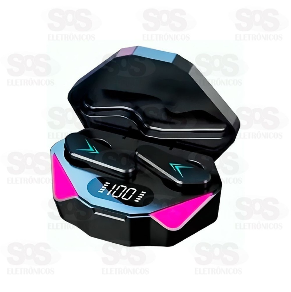 Estojo de carregamento com painel e luzes de LED.