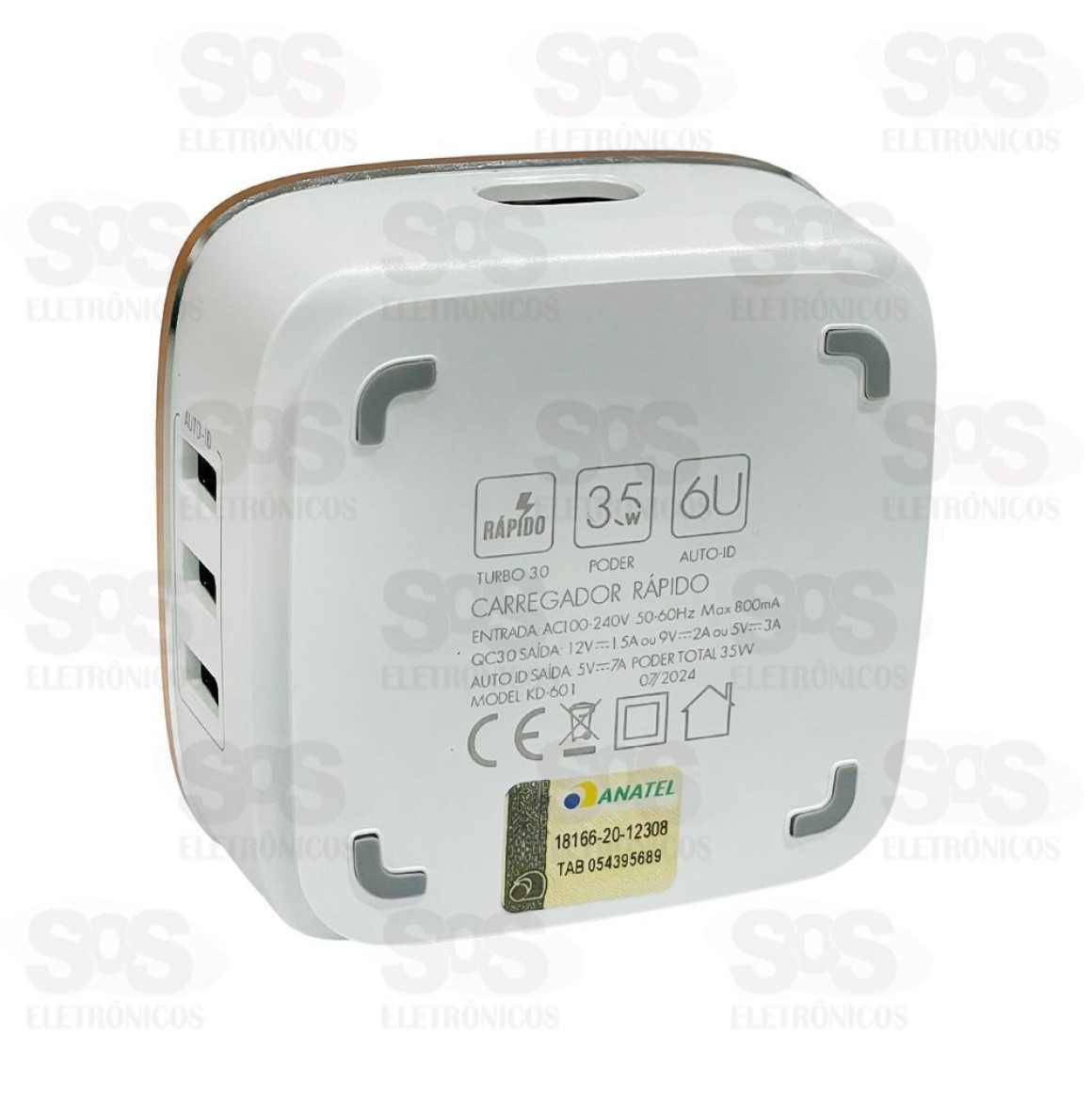 Hub USB 6 Portas 35W Auto-ID Kaidi KD-601 Hub de alta qualidade que possui 1 porta USB com carregamento turbo 3.0 e outras 5 portas com carregamento rápido de AUTO-ID. Feito de material resistente à altas temperaturas. Alta compatibilidade com diversos cabos e aparelhos. Acompanha cabo bipolar de 1 metro. Leve e portátil, fácil de carregar. Tamanho: 8 x 8 x 3,5 cm Cores variadas