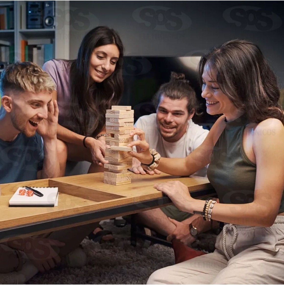 Montado em torre de blocos de madeira, o jogo exige habilidade e estratégia para não deixar a torre desabar. A adrenalina aumenta a cada movimento, tornando a experiência ainda mais emocionante.