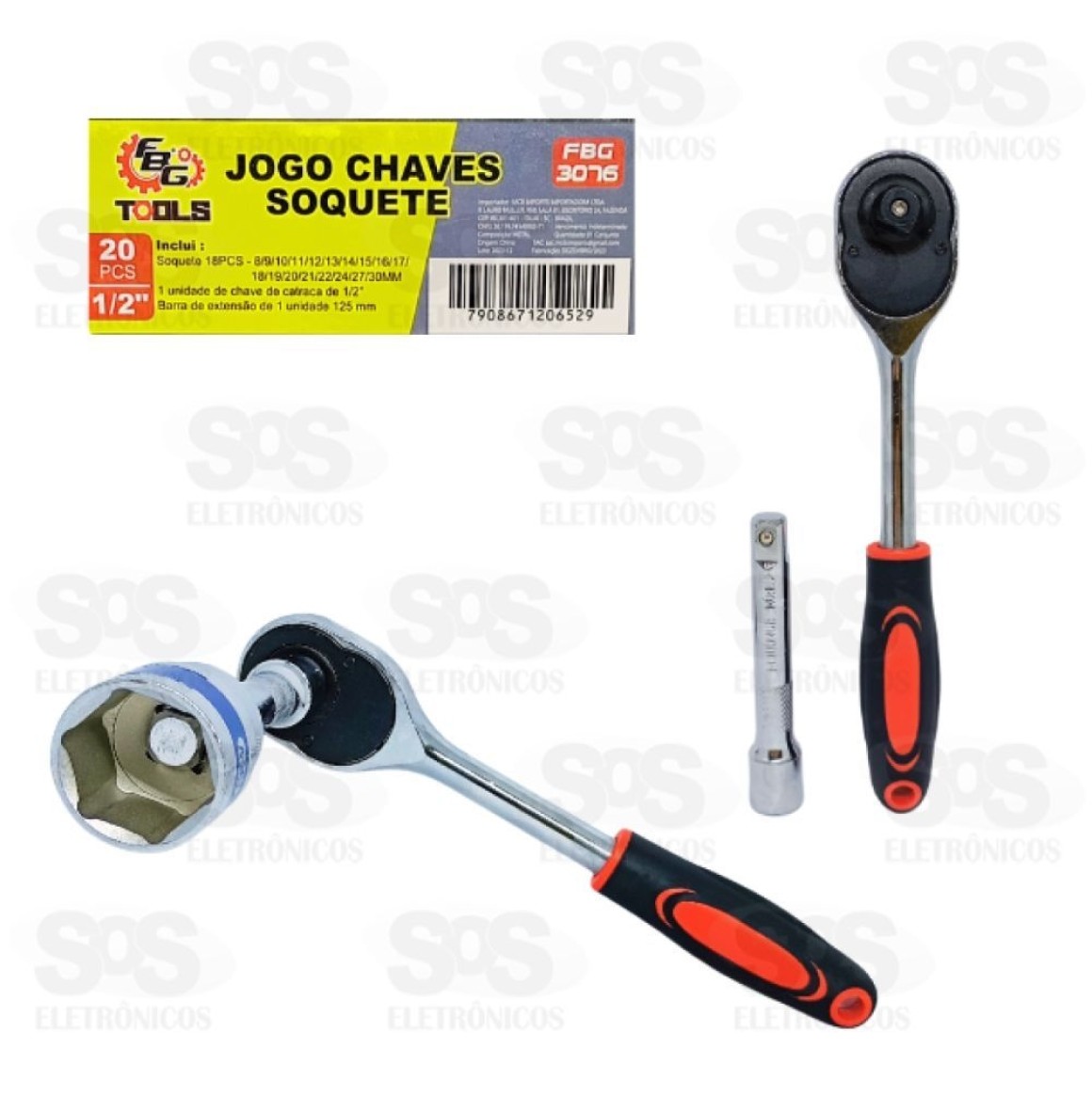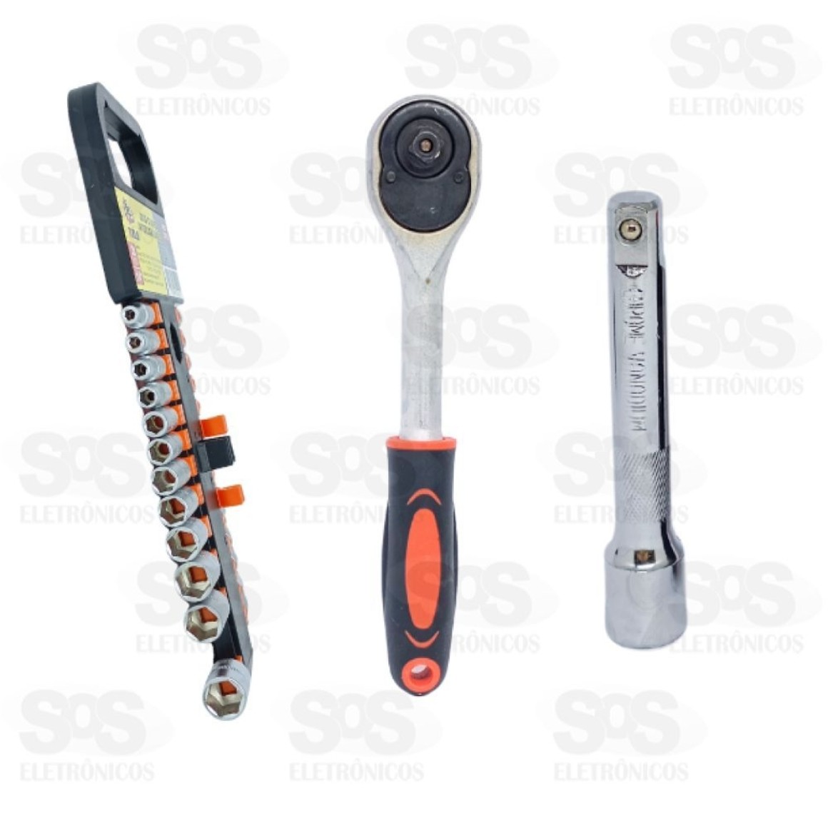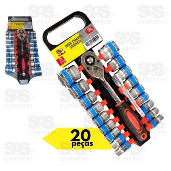 O jogo de soquete é composto por 18 peças, sendo uma catraca e dez soquetes.