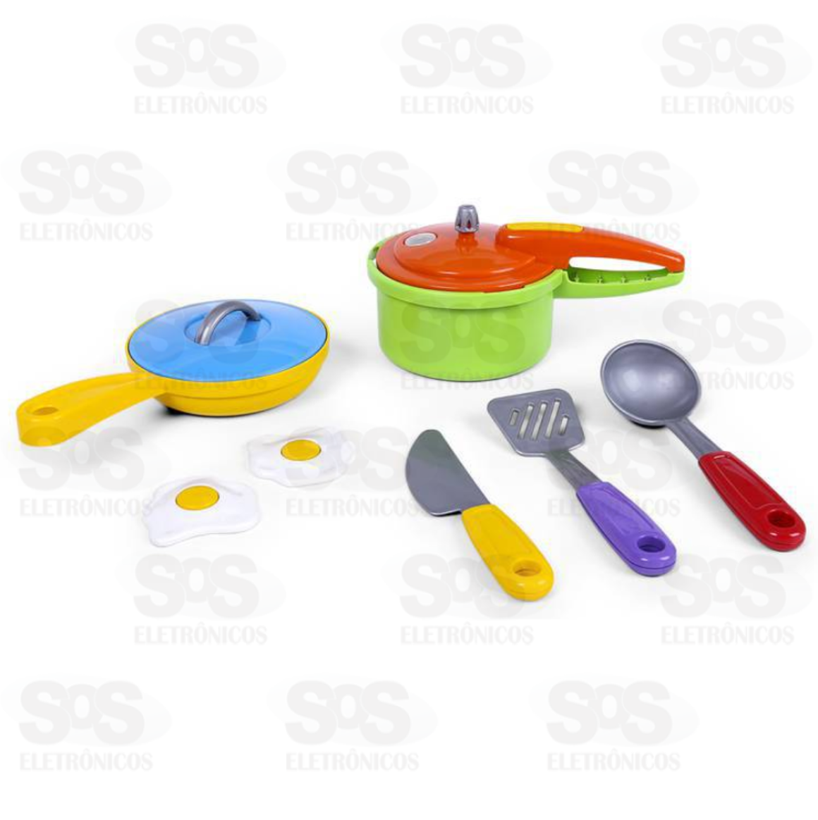Acompanha 1 panela de pressão, 1 frigideira com tampa, 3 talheres e 2 ovos.