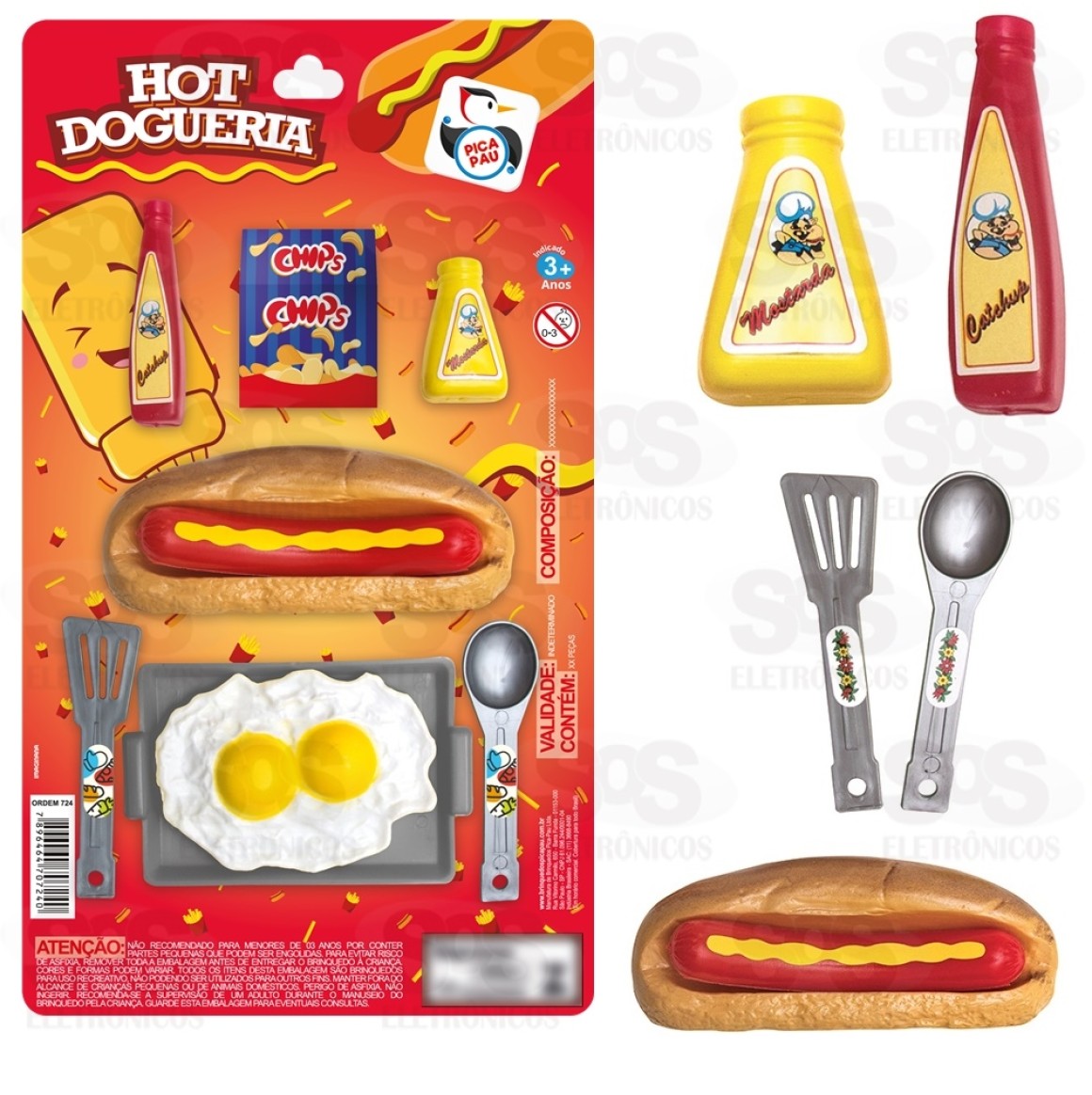 Contém em torno 9 Peças, Sendo 1 Pão, 1 Salsicha, 1 Caixa de Chips, 1 Catchup, 1 Mostarda, 1 bandeja, 1 ovo, 1 Colher, 1 espátula