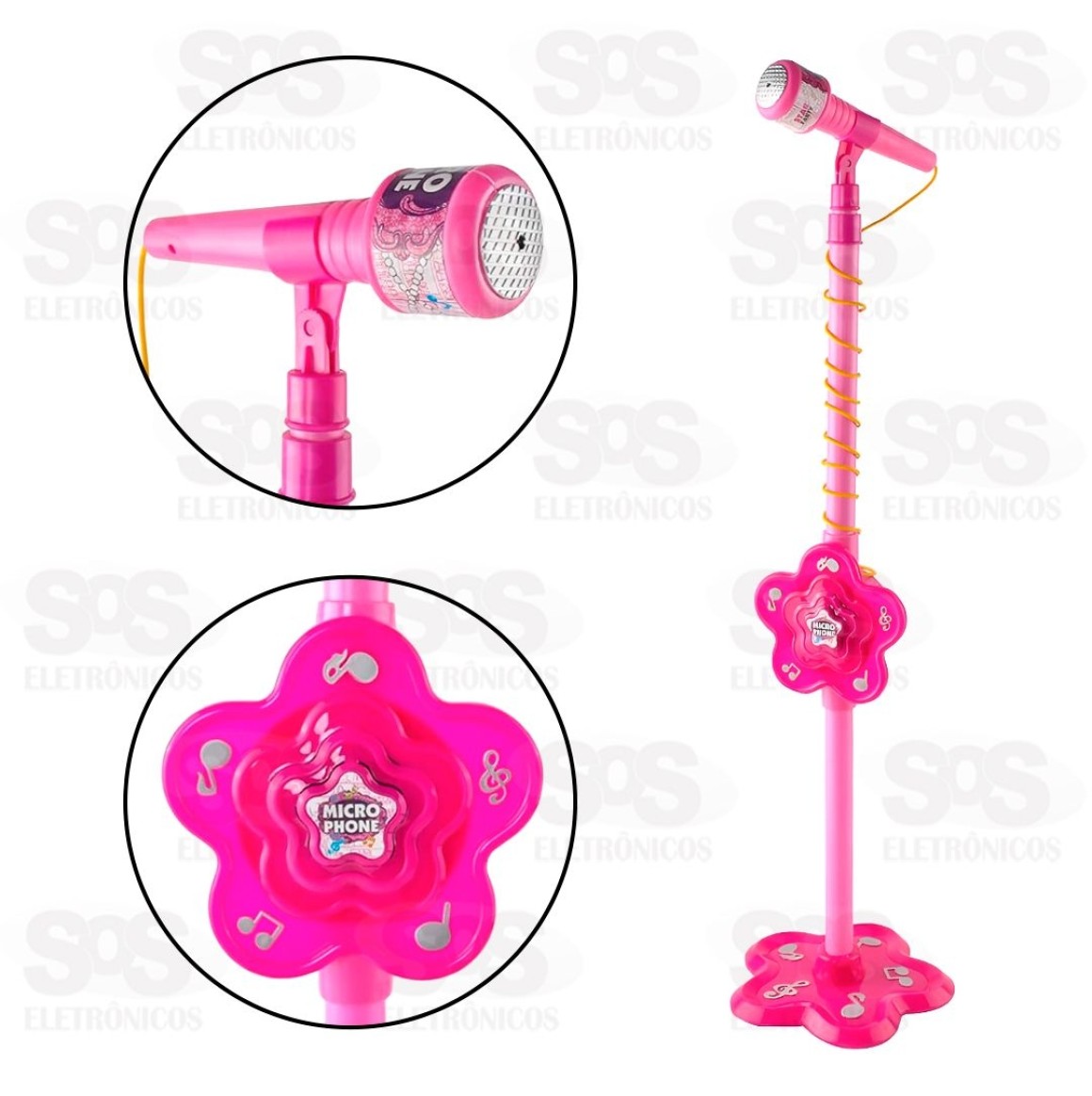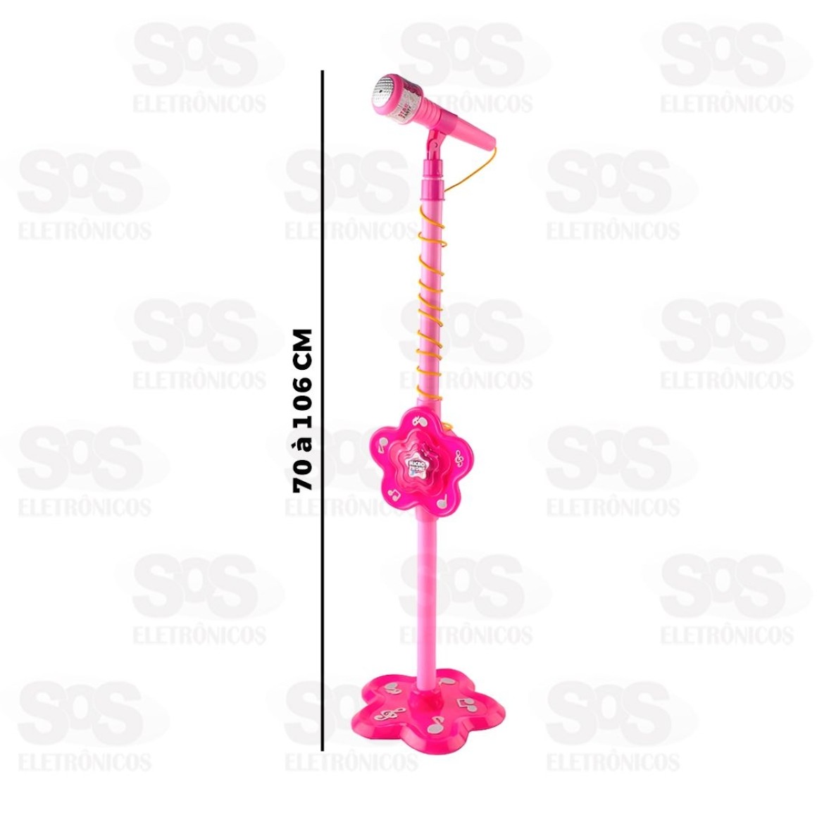 Microfone Infantil Com Pedestal Toy King TK-AB2956 Conjunto microfone e pedestal que as crianças vão adorar. O sonho de criança em forma de brinquedo. Conecta com o celular para função karaokê. Suporte ajustável para o microfone e pedestal com ajuste de altura de 70 à 106 cm. Tamanho do microfone: 17,5 x 4,5 cm Necessita de 3 pilhas AA (Não inclusas) Recomendado para crianças acima de 3 anos. Cor: Rosa