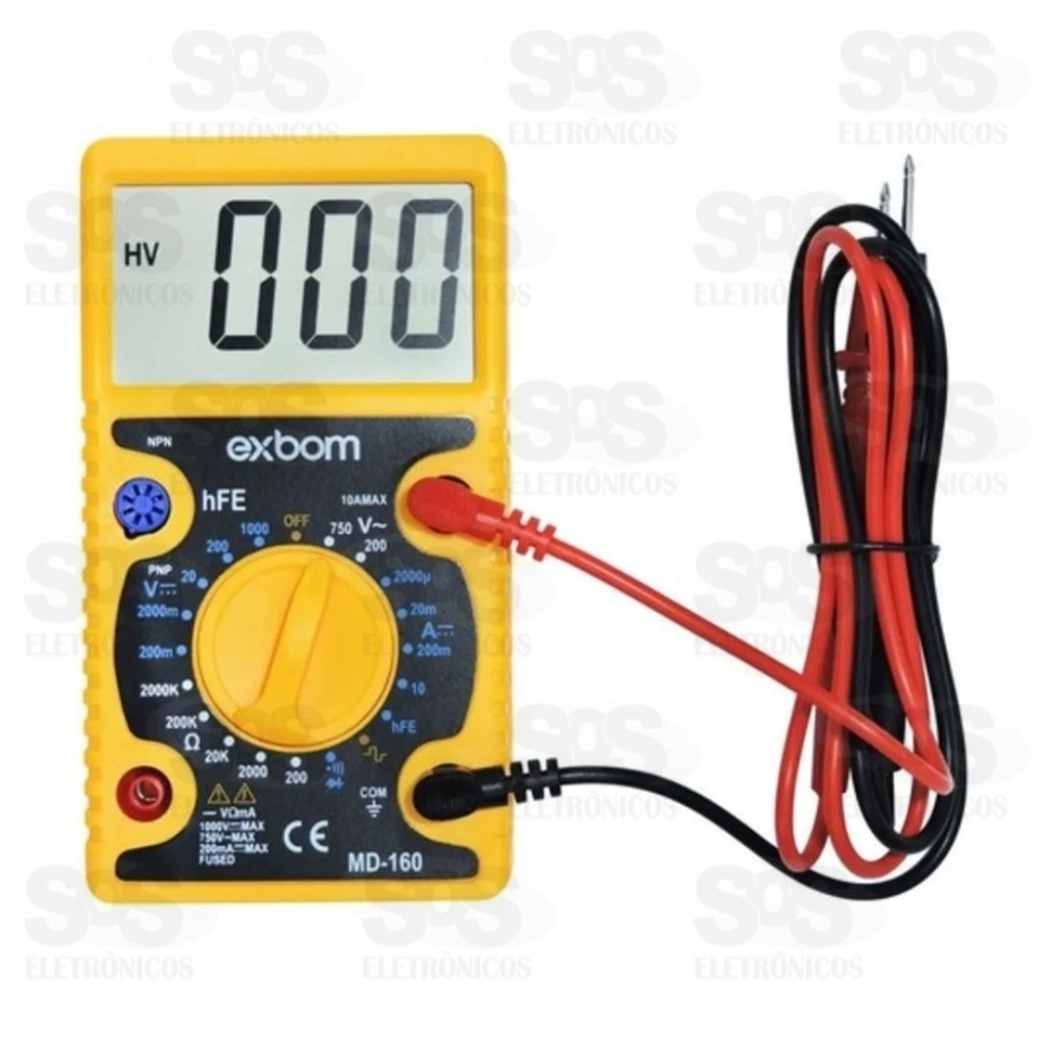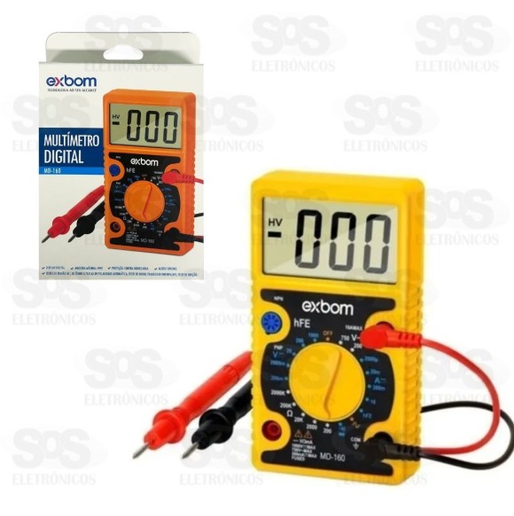 Multímetro Digital Com Cabo Exbom MD-160 Ferramenta ideal para eletricistas e técnicos de eletrônica. Ele mede a tensão contínua, tensão alternada, corrente contínua, teste de diodos, teste de transistores e resistência. - Display digital - Amostra máxima: 1999 - Proteção contra sobrecarga - Alerta sonoro - Tamanho: 12 x 7 cm - Cor: Laranja