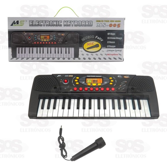 Teclado com 37 teclas, modelo moderno, com microfone e diversos tons e ritmos.