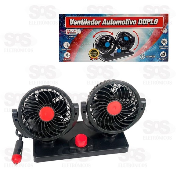 Ventilador Automotivo Duplo 12V YA-4135 Mini ventilador duplo ideal para carros, vans, ônibus e caminhões que não possuem sistema de ar condicionado. Também pode ser usado em barracas e áreas de caça ou pesca. Com 2 velocidades que podem ser ajustadas. Rotação livre vertical e horizontal em 360°. Baixo consumo de energia e baixo ruído. Adesivos para fixar o ventilador ao painel ou outra área. Tamanho do cabo: 2 metros Potência: 6,5W Tensão: DC 12V Tamanho: 26 x 14,5 cm