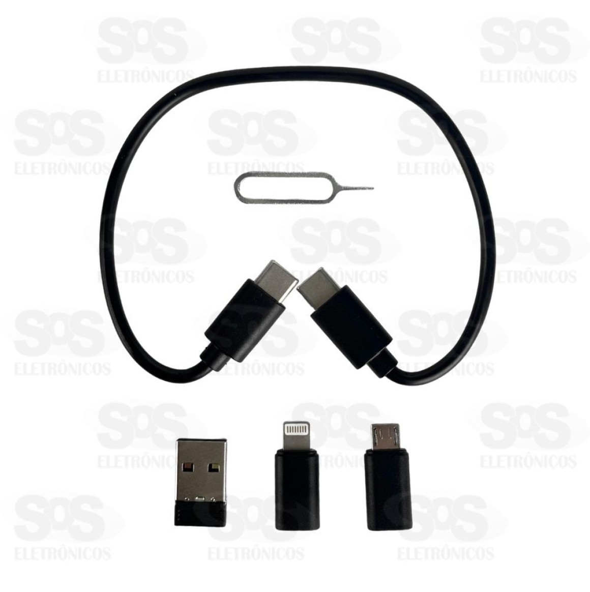 Acompanha Cabo Type C de 28 cm com adaptadores de 3 interfaces: Micro V8, Lightning e USB.
