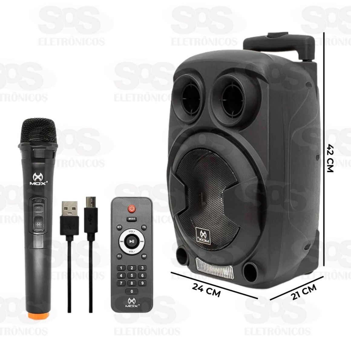 Acompanha um microfone wireless e controle remoto.
