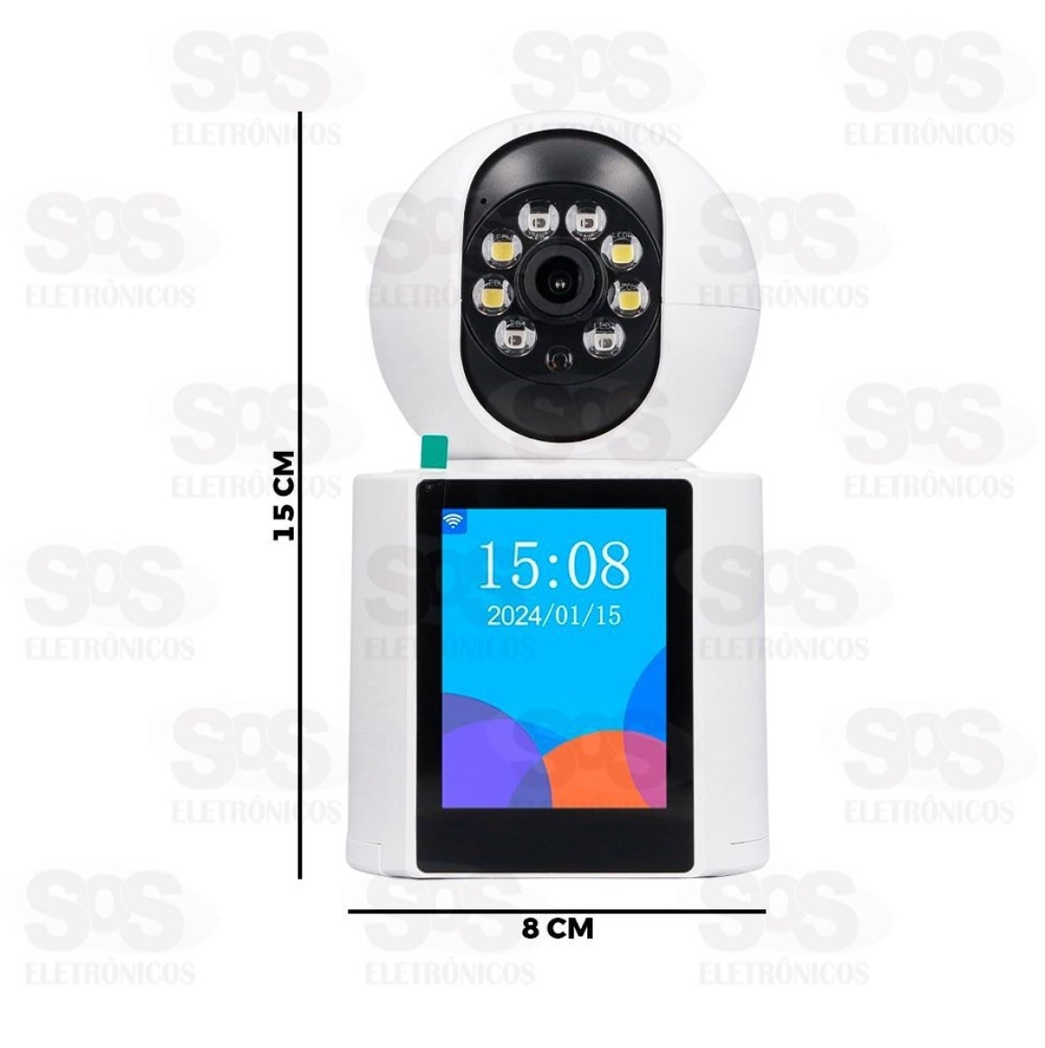 Possui tela de 2.4 polegadas e microfone que capta áudio bidirecional.
