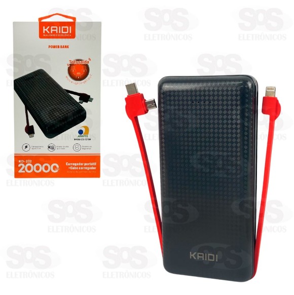 Carga Extra 20.000mAh Com 3 Interfaces Kaidi KD-232 Power bank com 20.000mAh para nunca mais ficar sem bateria nos aparelhos. Carregamento rápido e seguro.