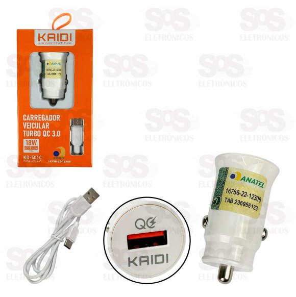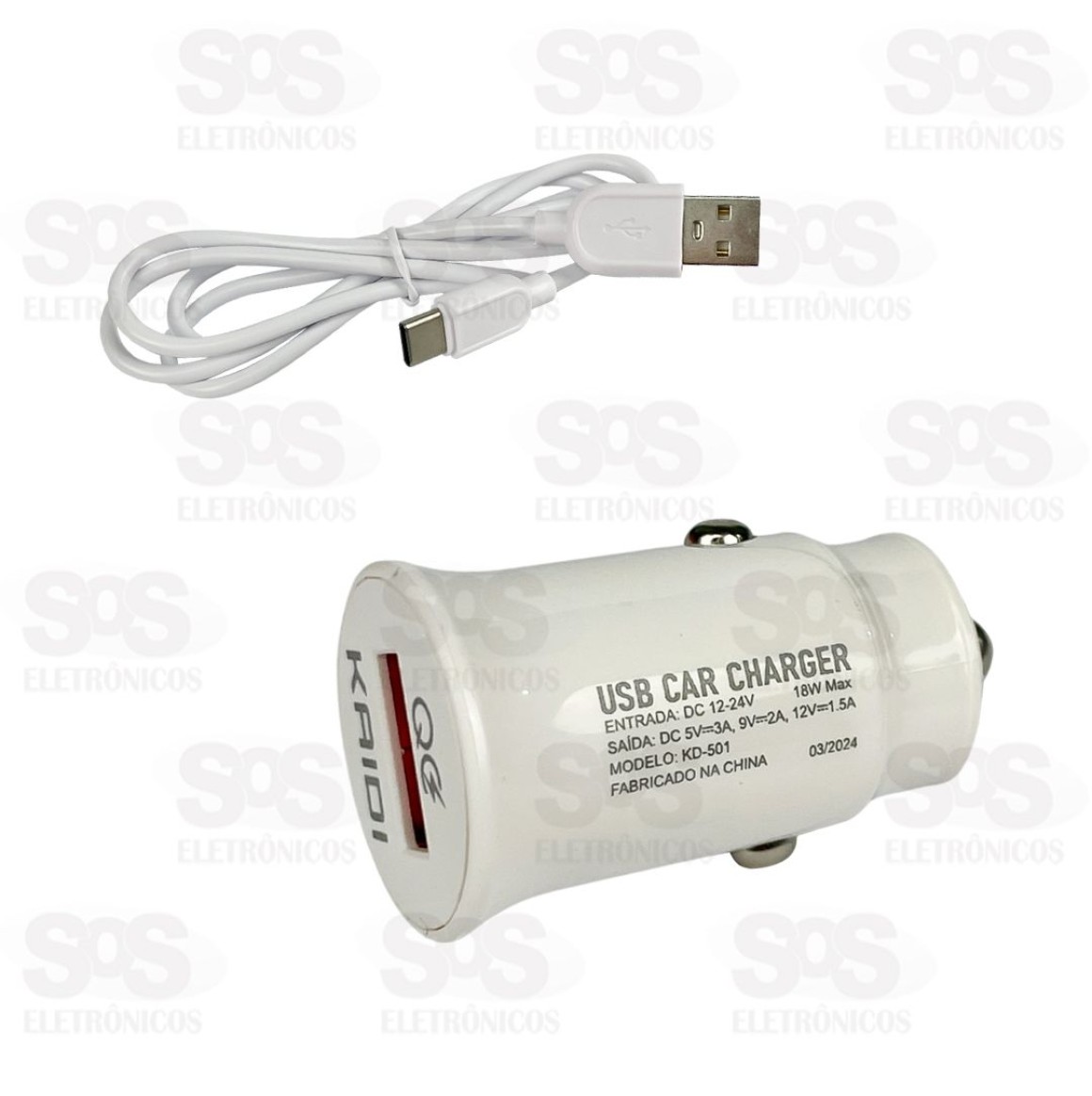 Carregador Automotivo USB 3.0 18W Cabo Type C Kaidi KD-501C
