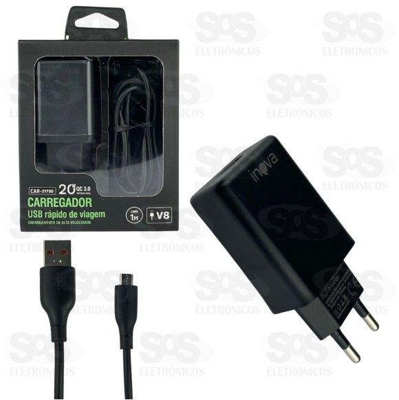 Carregador 20W Com Cabo Micro V8 Inova CAR-2175D Carregador rápido e inteligente, carregue seus aparelhos com entrada Micro V8 com segurança e velocidade. Proteção contra sobrecarga e chip inteligente. Marca: Inova Modelo: CAR-2175D