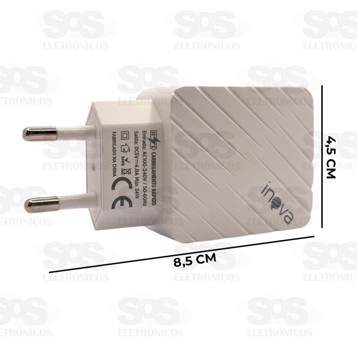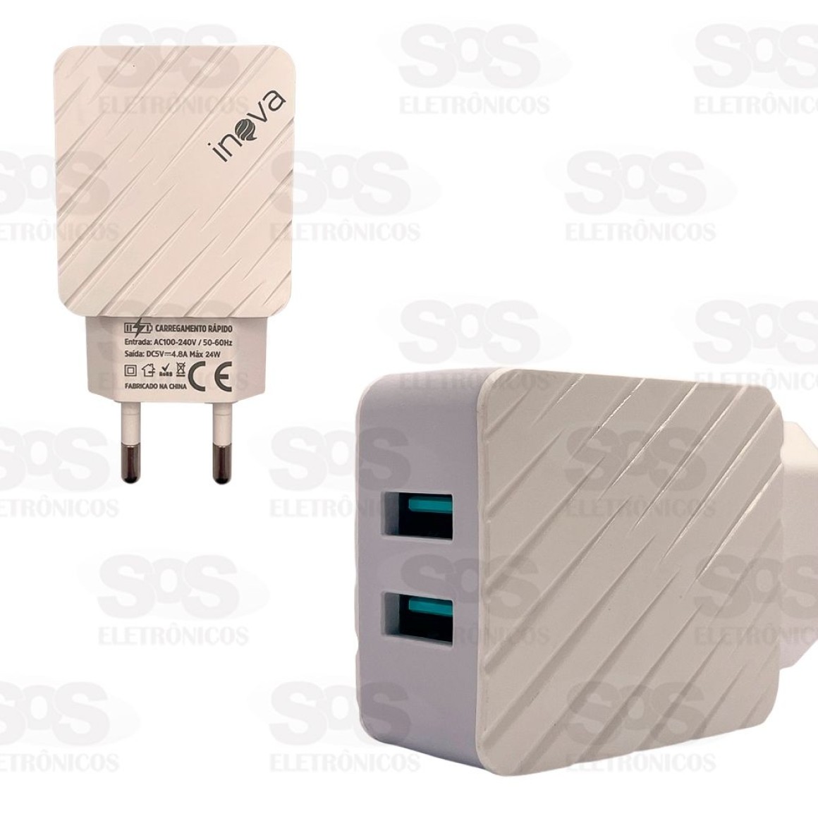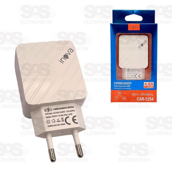Carregador Rápido 4.8A Com 2 USB Inova CAR-5254 Carregador rápido e inteligente, carregue seu smartphone, tablet, câmera, gps, e outros aparelhos com segurança e alta velocidade. Conta com 2 entradas USB.